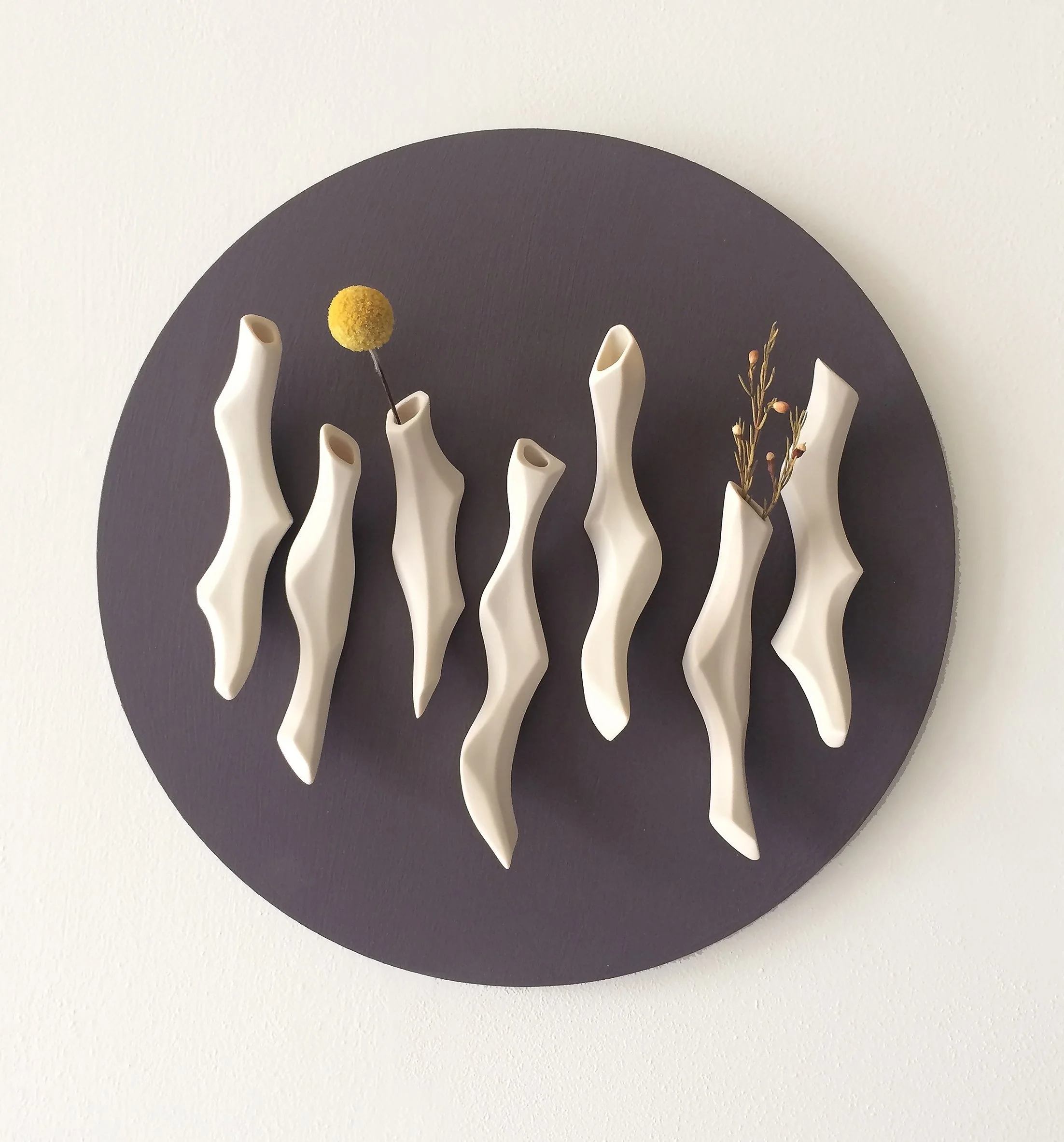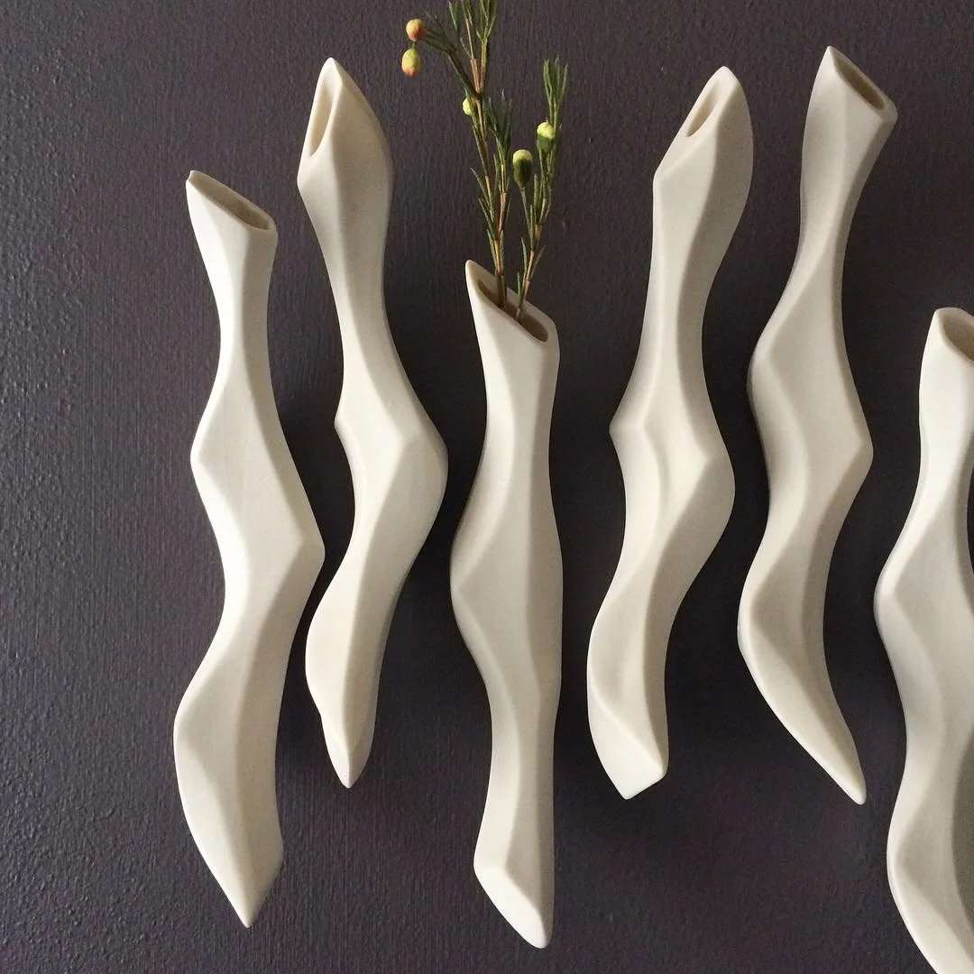 Hand carved and cast porcelain pieces, 5βto 6β long can be shown as bud vases for a small dried flower or as sculptural objects.