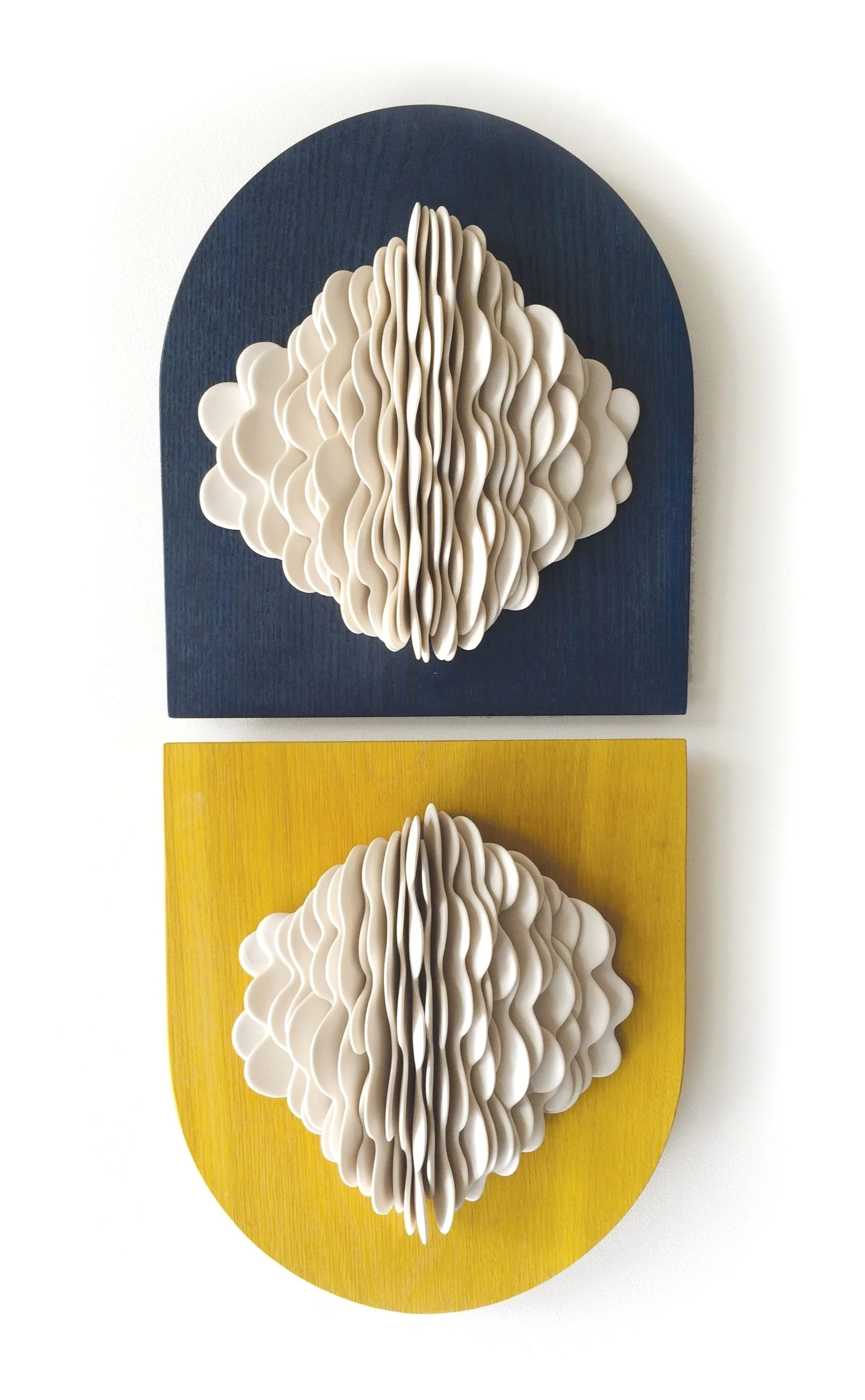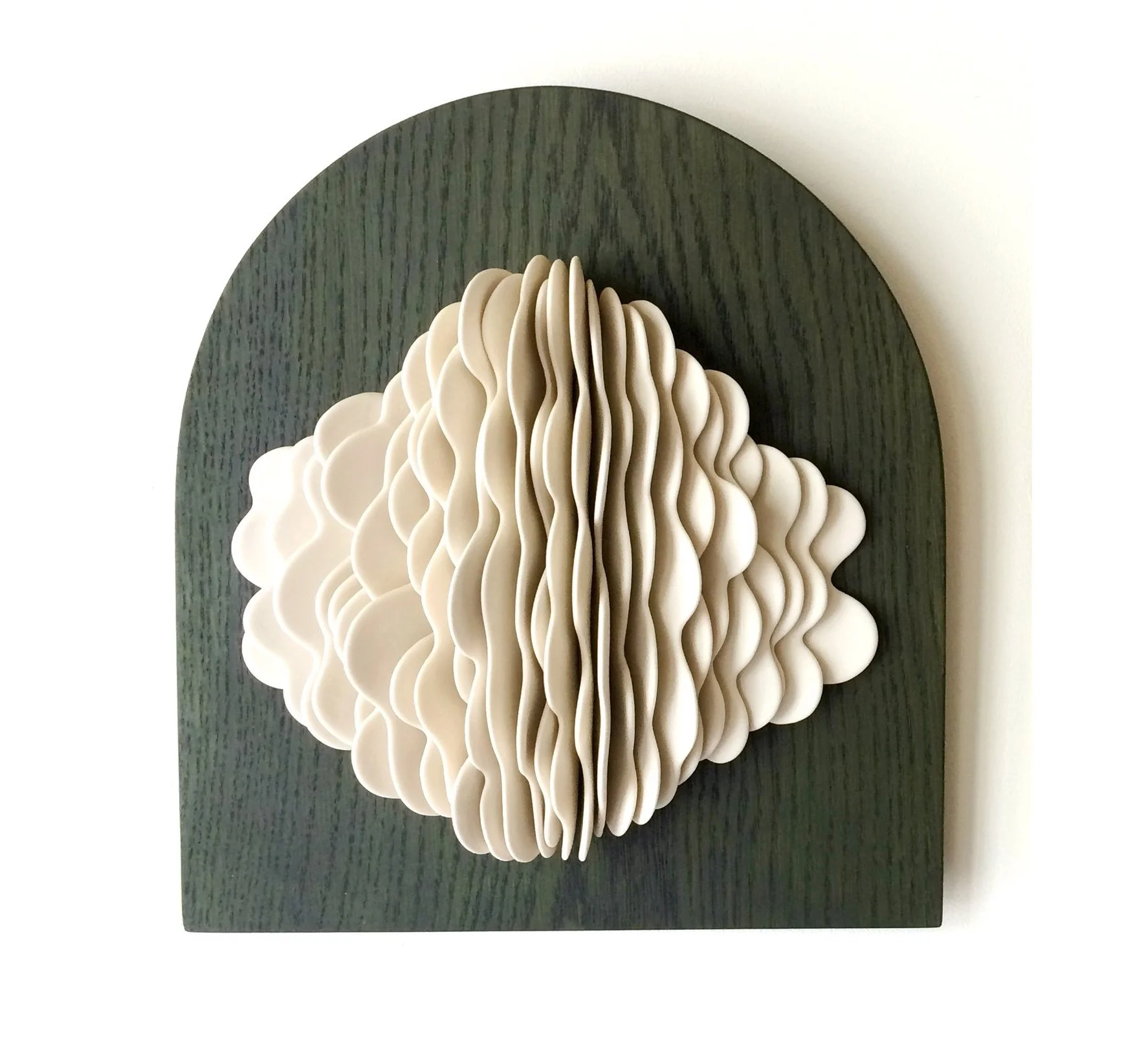 Each porcelain 'petal' is uniquely nested together to created blooms and mounted on dyed white oak.